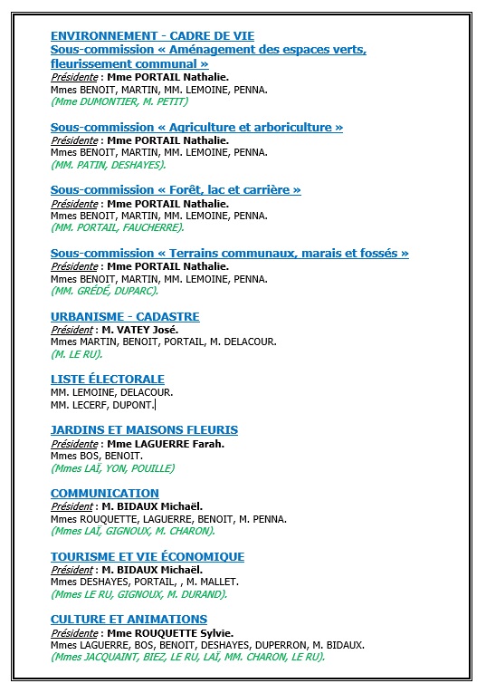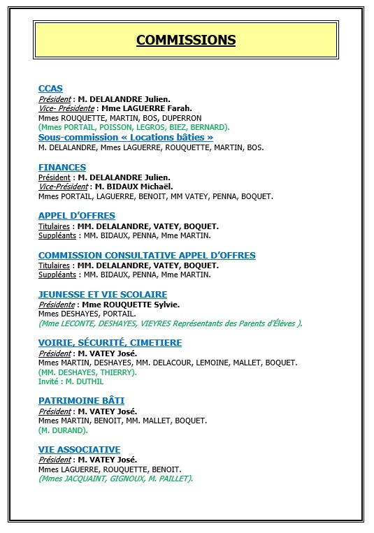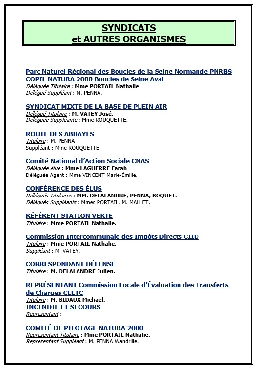 Compte-rendusCommission culture et animationsCommission voirieCommission finances et vie associativeCommission maisons et jardins fleurisCommission environnement - cadre de vieCommission communicationCommission patrimoine bâtiCommission vie scolaireCommission restaurant scolaire Parc Naturel Régional des Boucles de la Seine NormandeCarrières STREF